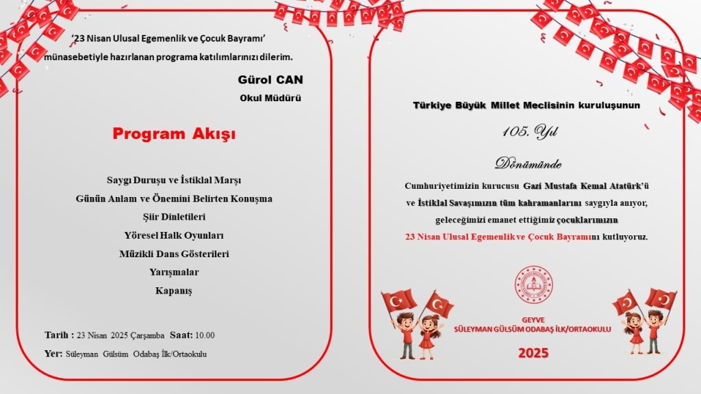 23Nisan Ulusal Egemenlik ve Çocuk Bayramı Kutlamamıza Davetlisiniz